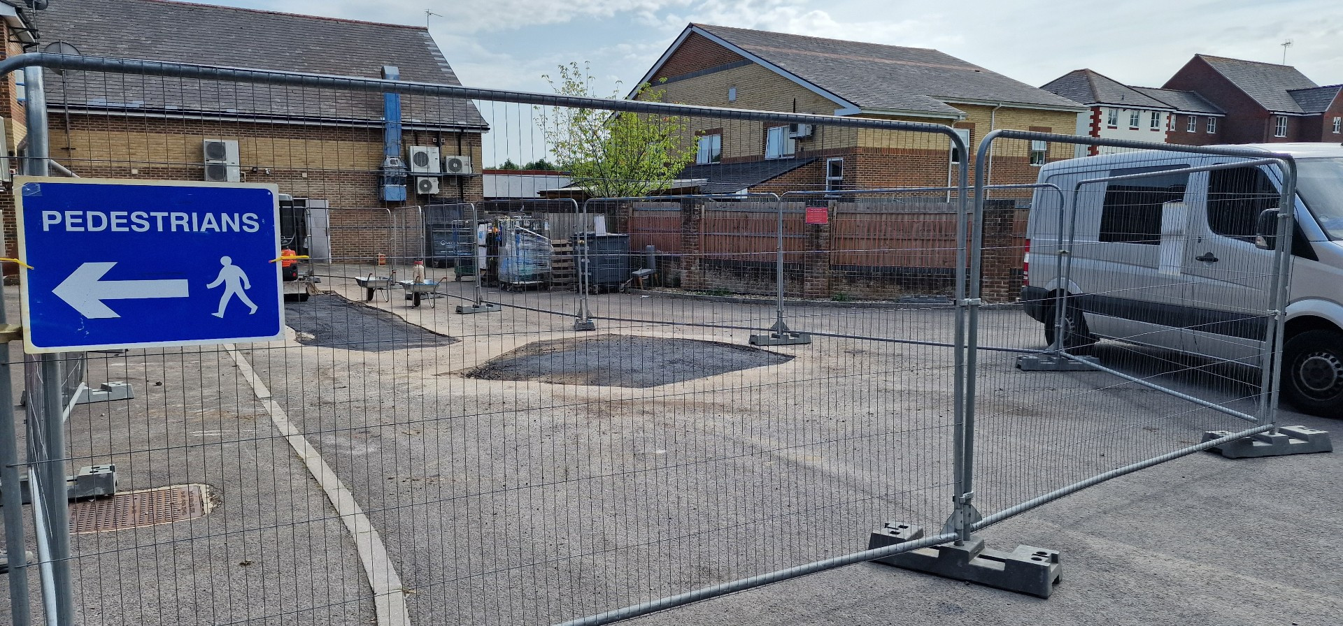 Tarmac patch repair completed within a commercial service area to restore surface integrity, followed by installation of durable car parking bay markings.