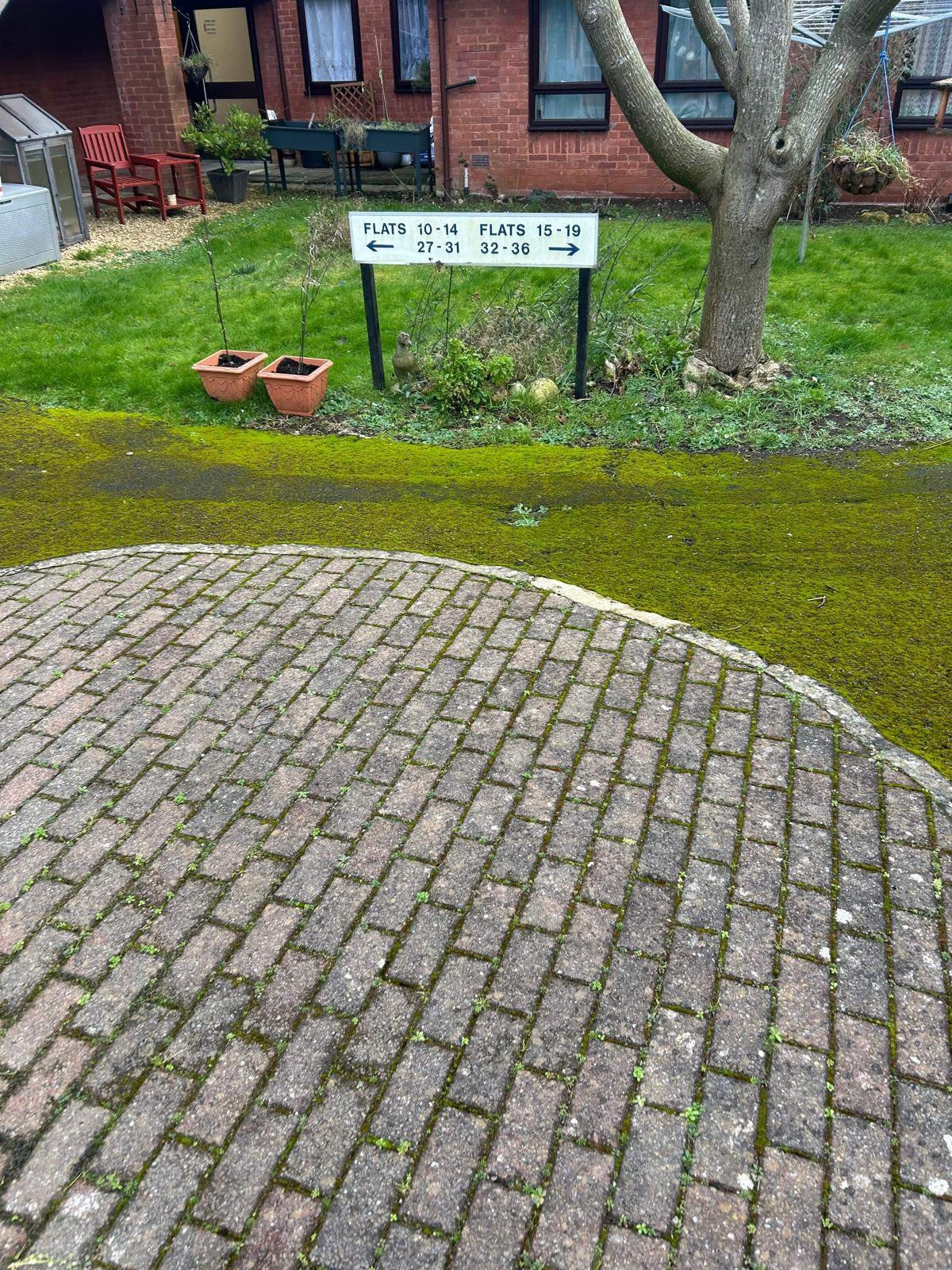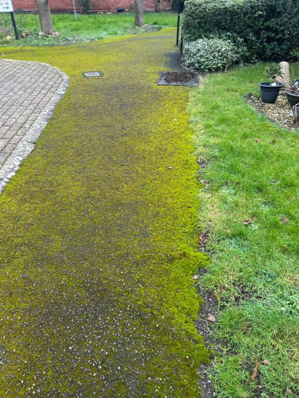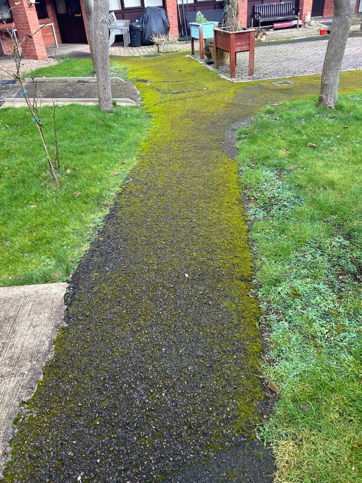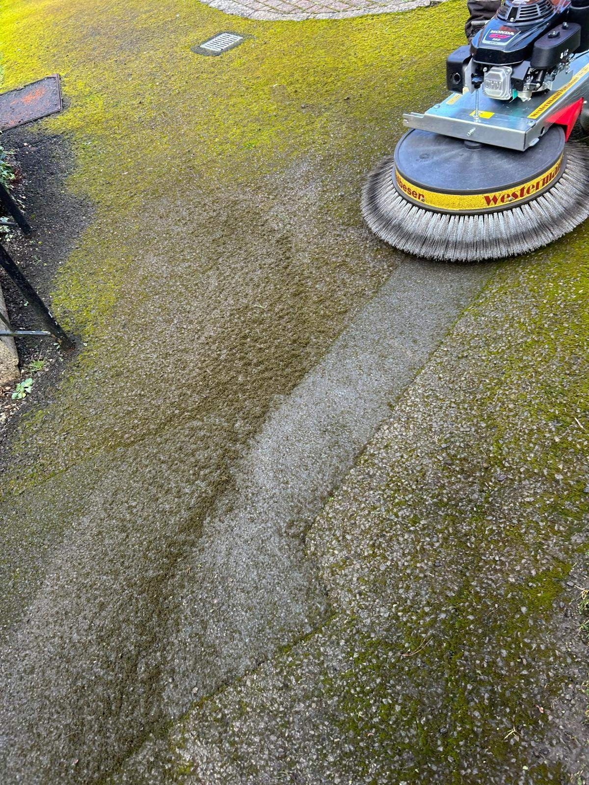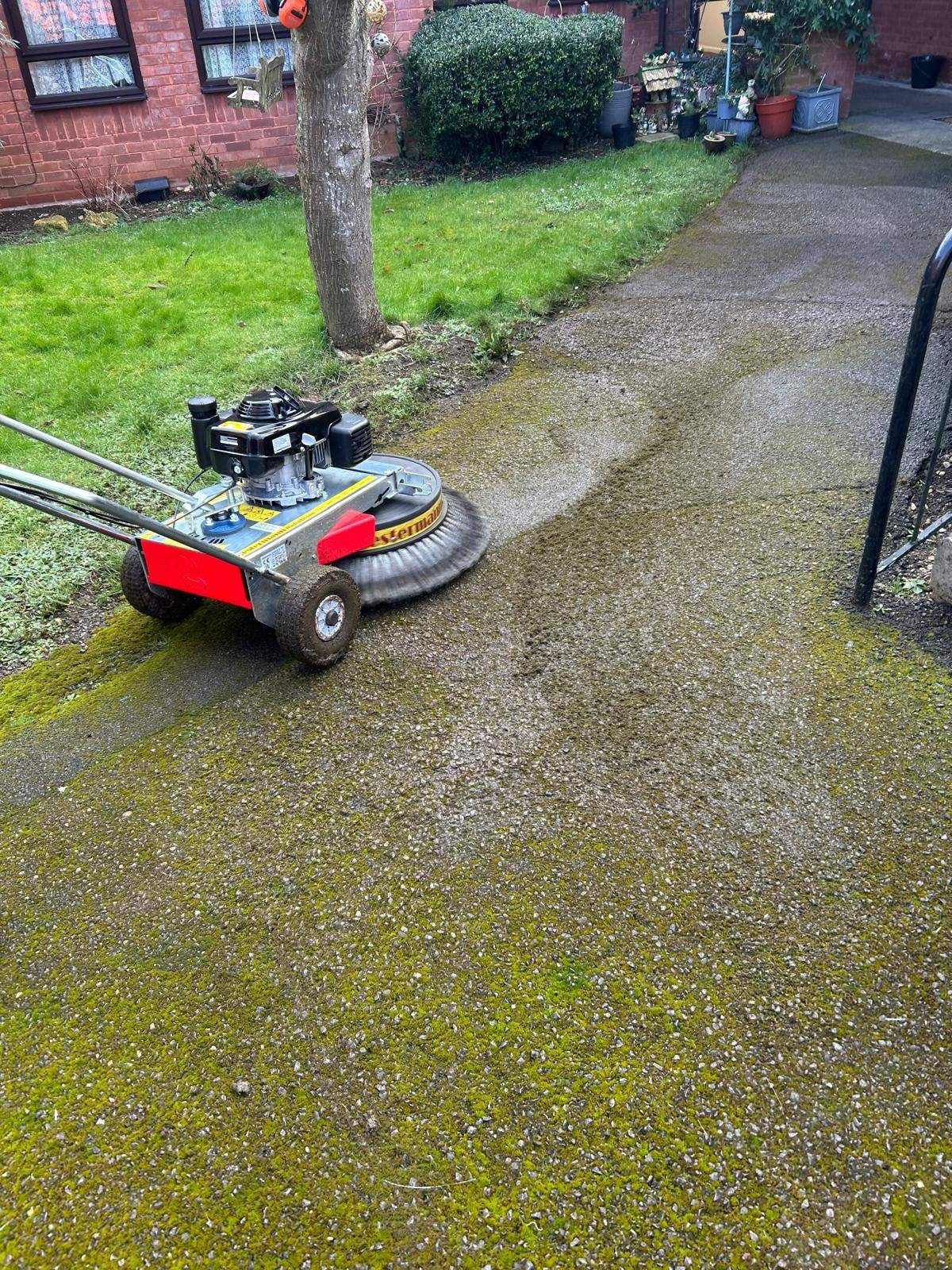 Moss removal carried out across internal pedestrian pathways using a specialist brush system, restoring surface cleanliness and improving safety underfoot while maintaining a chemical-free approach.