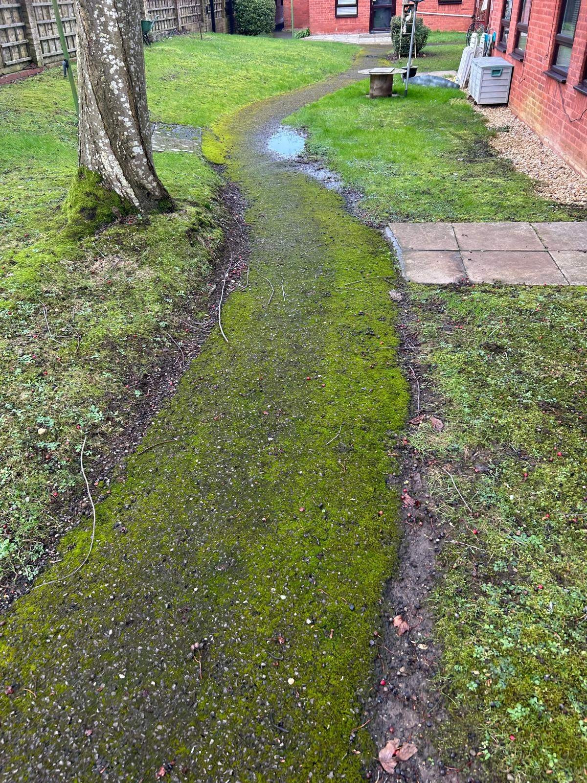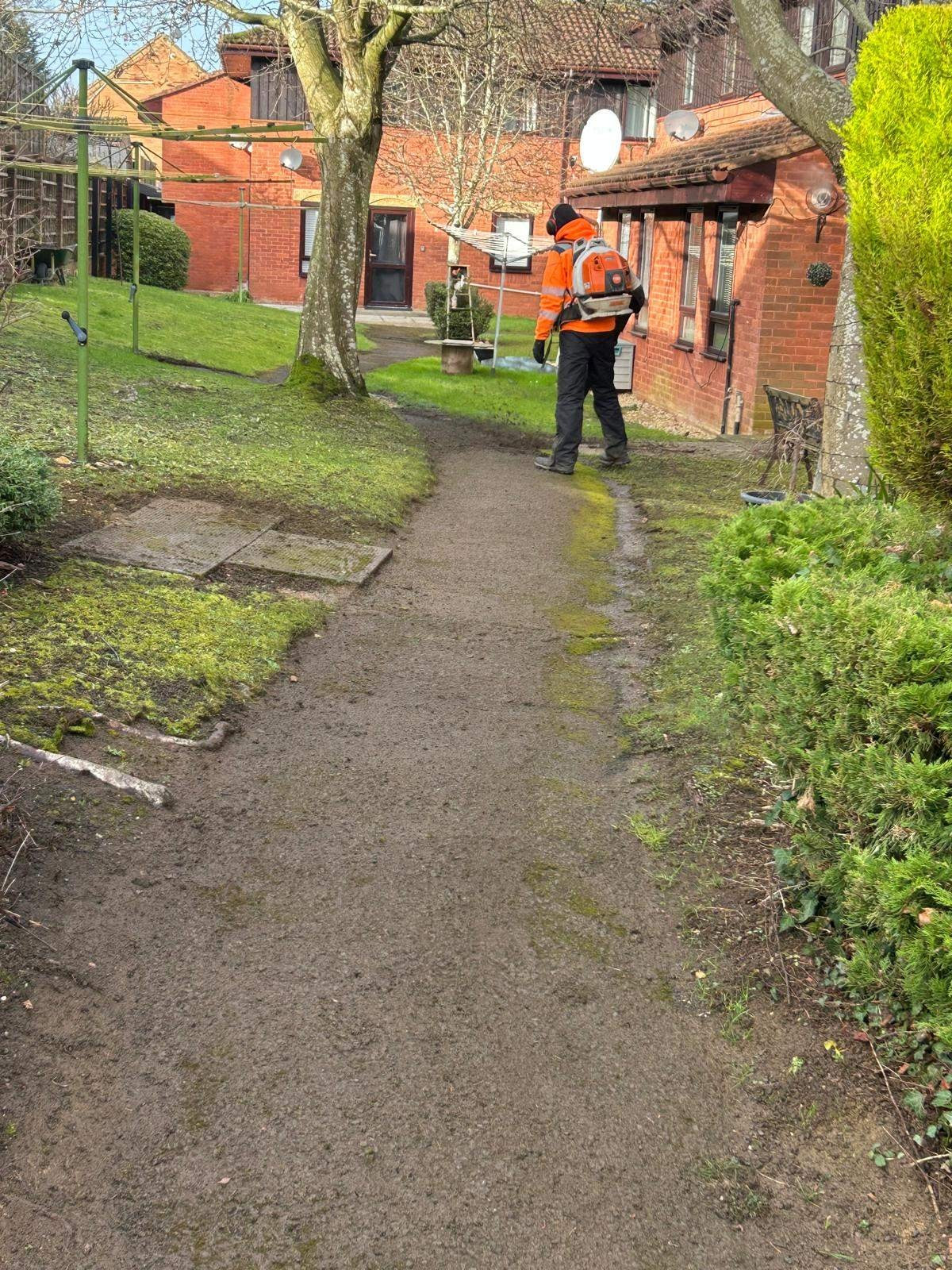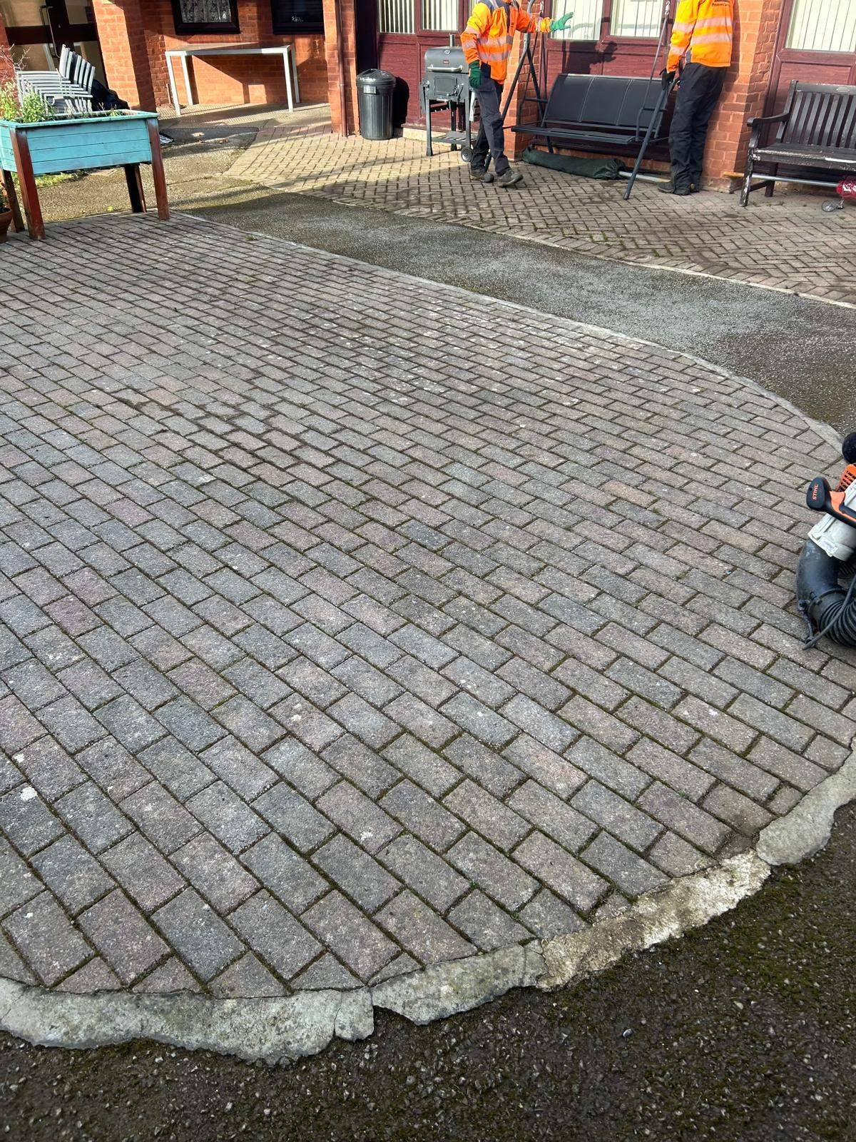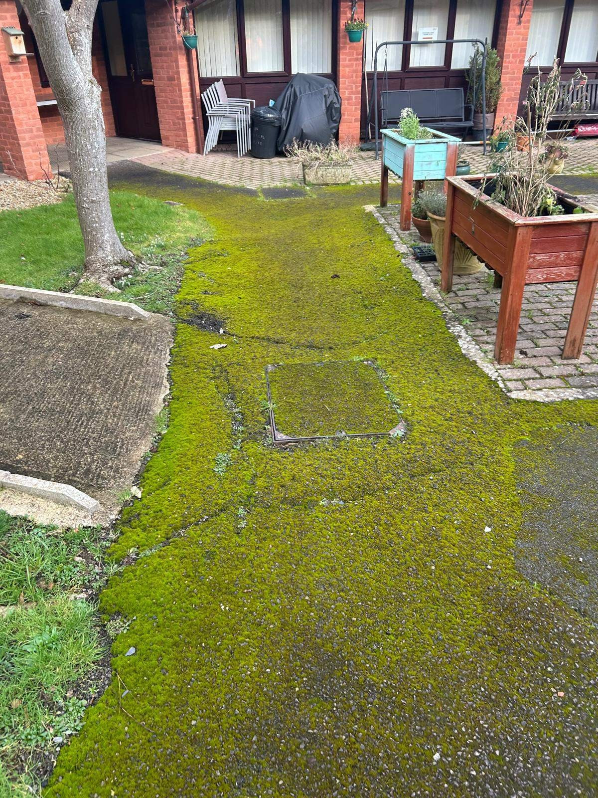 Moss removal carried out across internal pedestrian pathways using a specialist brush system, restoring surface cleanliness and improving safety underfoot while maintaining a chemical-free approach.