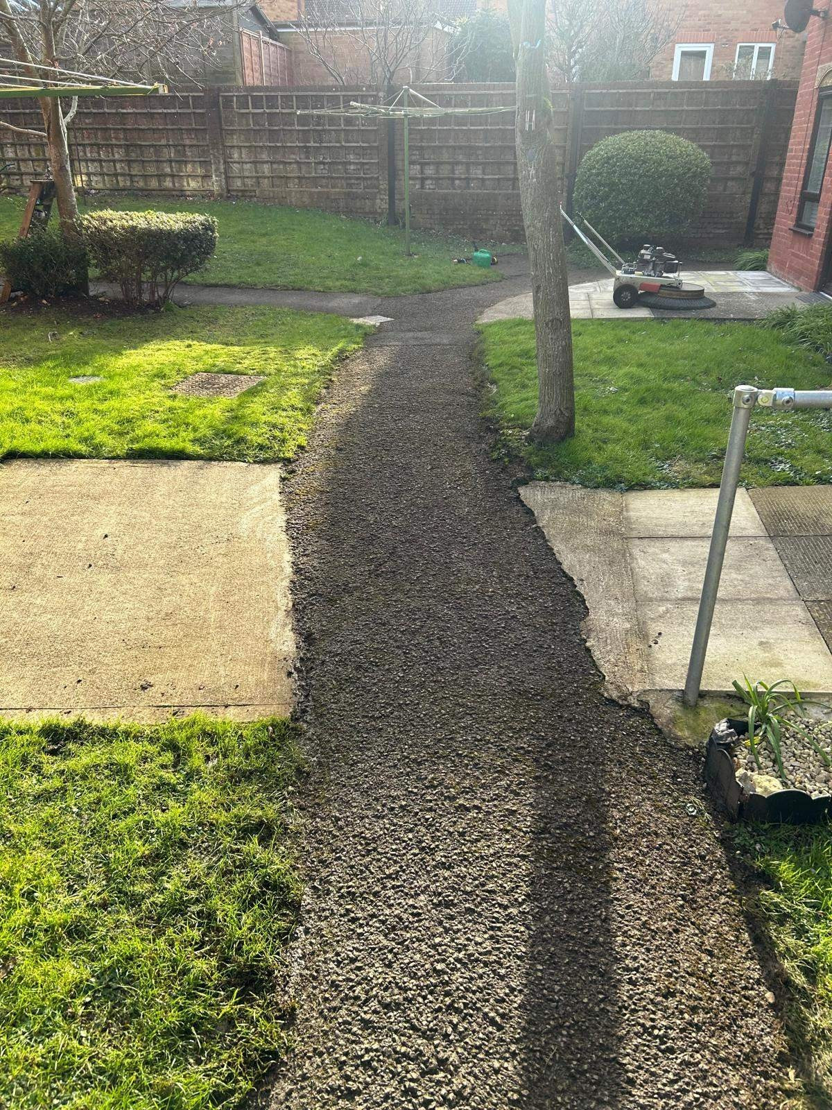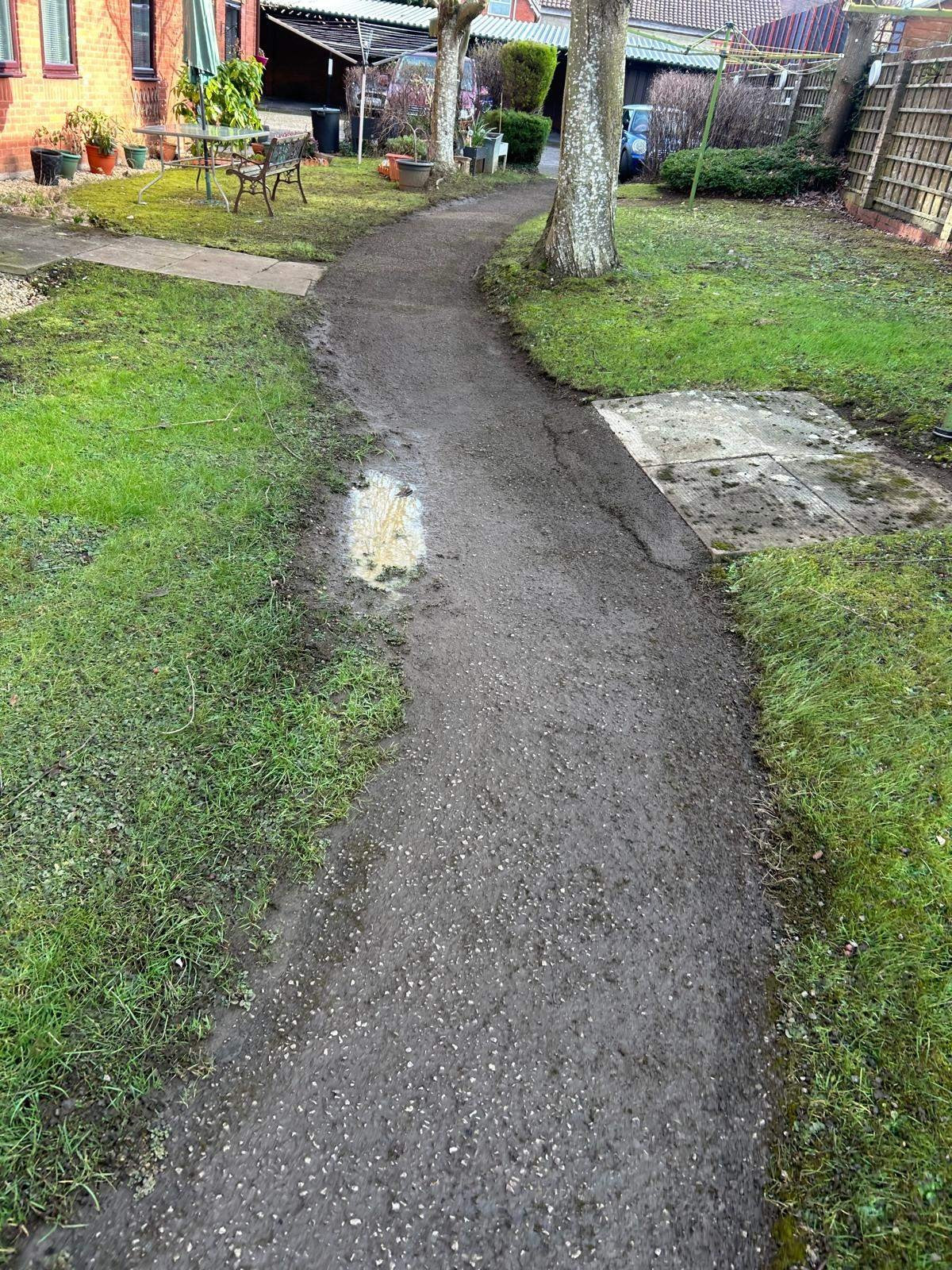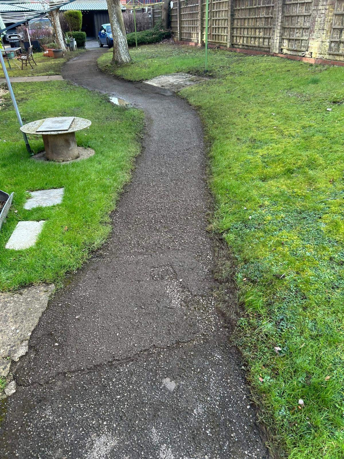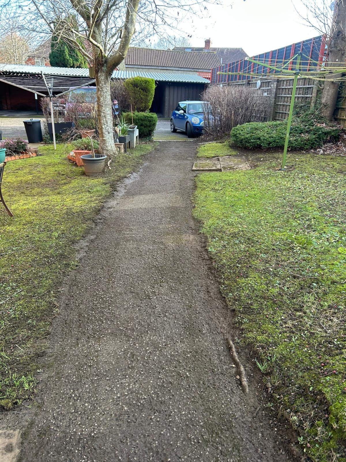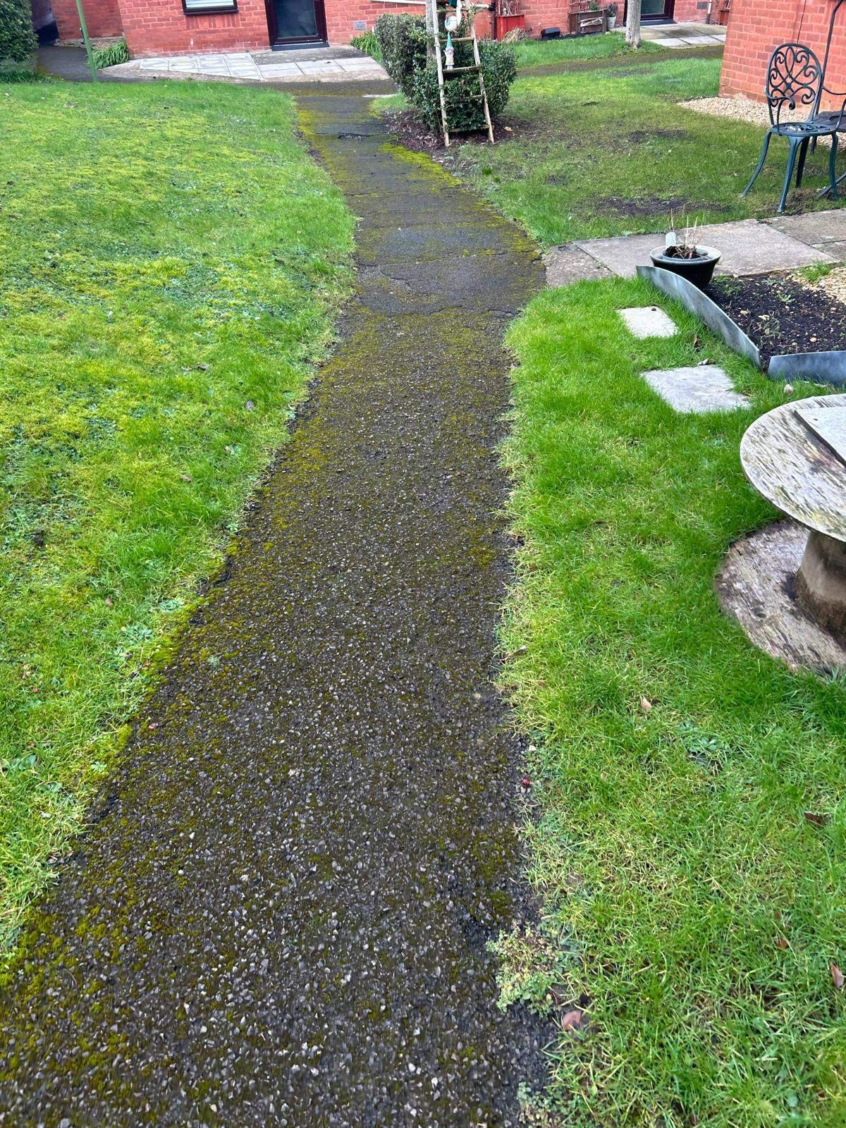 Moss removal carried out across internal pedestrian pathways using a specialist brush system, restoring surface cleanliness and improving safety underfoot while maintaining a chemical-free approach.